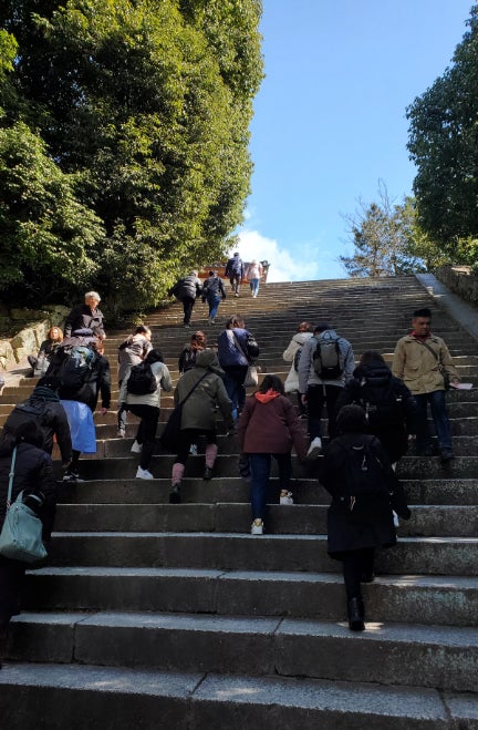 <名所4:知恩院>昼食を終え、国宝に指定されている御影堂がある知恩院に向かいました。南側入り口は、「男坂・女坂」という坂道があり、男坂は一段が高めの急な階段、女坂は緩やかな坂道になっています。その坂を浅田真央さんと参加者は各々どちらで進むかを選択。浅田真央さんは「どちらかを選ぶ時は迷わず困難な方を選びます!」とのことで、男坂を選択。参加者も一緒になって男坂を登っていきました。