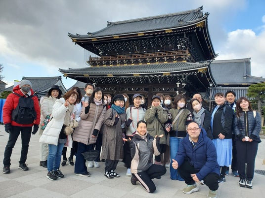 <名所1:東本願寺>今年で752年の歴史がある東本願寺からウォーキングをスタートしました。まずは、木造建築の二重門としては日本一の高さを誇る御影堂門をバックに記念撮影を行いました。