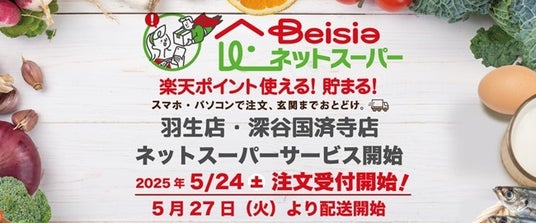 株式会社ベイシア(本社:群馬県前橋市、代表取締役社長:相木孝仁)は、楽天グループ株式会社(以下「楽天」)が提供するネットスーパーのプラットフォーム「楽天全国スーパー」内に出店する「ベイシアネットスーパー」において、ベイシア羽生店・深谷国済寺店からの配送を2025年5月27日(火)より開始いたします。