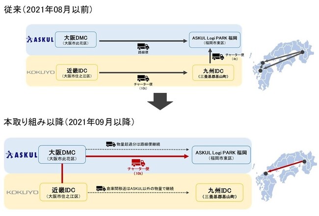 従来、関西地域でコクヨサプライロジスティクスからアスクルへコクヨ社製品を納品するには、コクヨ「近畿IDC」(大規模大阪拠点)からチャーター便(※1)を手配し、一度コクヨ「九州IDC」(小規模九州拠点)へ在庫輸送し、そこからアスクルの物流センター「ASKUL Logi Park福岡」(以下、「ALP福岡」)に納品をしていました。一方アスクルでは、日々の需要変動に応じ自社物流センター「大阪DMC」から「ALP福岡」へ在庫商品を移動する「物流センター間輸送」が発生し、路線便(※2)を手配して横持ち輸送を行っていました。