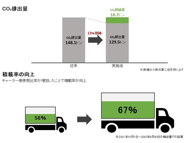 ■実証実験の成果 本実証実験を通じて輸送車両の集約化を実現し、同一の輸送物量に対してのCO2排出量を削減、車両積載率を向上させました。この結果を踏まえ、2022年10月より本格稼働し、両社の物量調整を実施しながら現在も取り組みを継続しています。