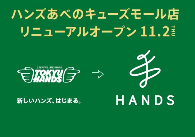 株式会社ハンズ株式会社ハンズ(本社:東京都新宿区)は、11月2日にハンズあべのキューズモール店の看板・サインを新しいロゴへ変更し、リニューアルオープンしたことをお知らせいたします。