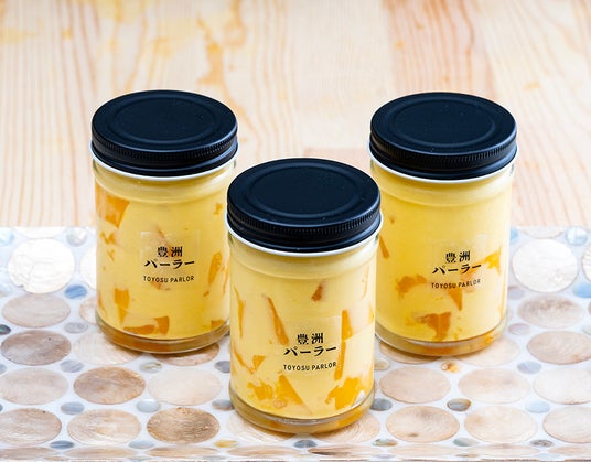スイーツに使う果実は、打ち身やキズのある店頭には置けないものを使うことが一般的です。しかし今回は、豊洲パーラーとしてふさわしい品質を追求し、ゴロゴロと瓶に詰める果肉には、JA認証の「みやざき完熟マンゴー」のみを使いました。アーウィン種のマンゴーを自然に落果するまで樹上で完熟させるので、濃厚な甘みと芳醇でとろけるような果肉が楽しめます。