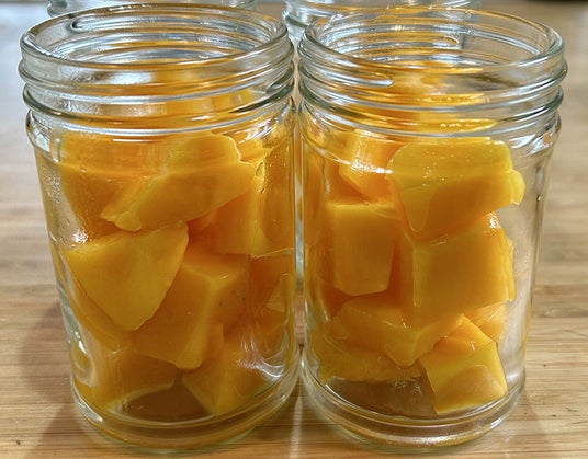 瓶の口の辺りまで、しっかり詰まった生果のマンゴーをご覧ください。プリン1個160gのうち、カットした「みやざき完熟マンゴー」は約90g入っています。