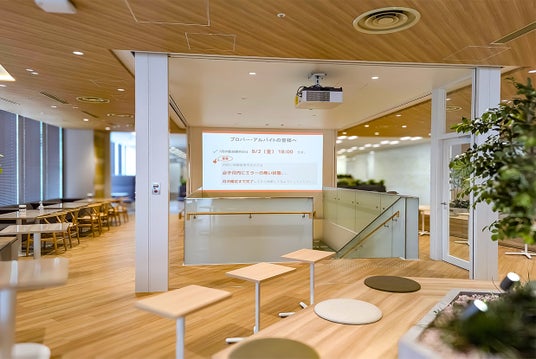 新オフィスは、合計で約2,400坪(約8,000平方メートル )もある大きなオフィスで2フロアに分かれているため、フロアごとに交流が途切れやすいといった懸念があり、カフェスペースに内部階段を設置して2フロアを結び、行き来しやすくしました。カフェスペースやオフィス内の回遊動線にあるポケットミーティングスペースなどで、社員同士の交流や新しいアイデアなどが生まれているようです。