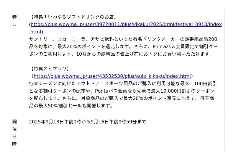 さらに、ハズレなしで最大3,000円の割引クーポンが毎週あたる「ポイントUPセレクト特典ガチャ」や対象店舗での日曜日のお買い物で5%のポイント還元となる「Pontaパス特典」など、Pontaパス会員限定の特典も充実しています。