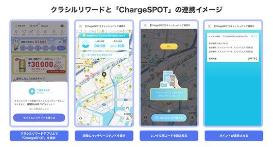 本連携により、クラシルリワードのアプリ上で「ChargeSPOT」のレンタル用のQRコードを読み取ることが可能となり、そのままクラシルリワードを経由してバッテリーをレンタルすることでポイントが貯まる仕組みを提供します。