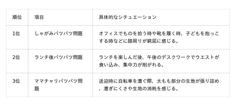 日常のあらゆるシーンに潜む「パツパツ問題」TOP3上記から、多くの方が抱えている膝やお腹周りパツパツ問題の悩みTOP3を「しゃがみパツパツ問題」「ランチ後パツパツ問題」「ママチャリパツパツ問題」としました。育児と仕事を両立する女性たちの、リアルな悩みが反映されたランキングとなりました。