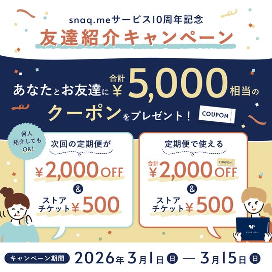 株式会社スナックミー(本社:東京都中央区 / 代表取締役:服部慎太郎)は、2026年3月におやつ体験BOX『snaq.me『スナックミー』」の正式リリースから10周年を迎えます。この節目を記念し、10年間で積み上げたデータと歩みを振り返るインフォグラフィックを公開いたします。