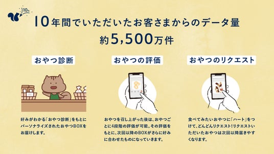 この10年間、お客様から寄せられた「おやつ診断」「おやつの評価」「リクエスト」の総量は約5,500万件に達しました。この膨大なデータはスナックミーにとって、なくてはならない、かけがえのないものです。