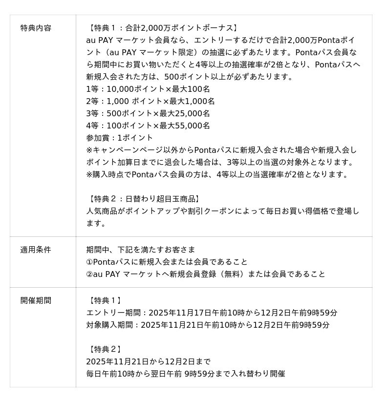 auコマース&ライフ株式会社最大50%のポイント還元や合計2,000万Pontaポイントボーナスなど今年最大の特典が満載で、最もおトクな11日間が11月21日よりスタート
