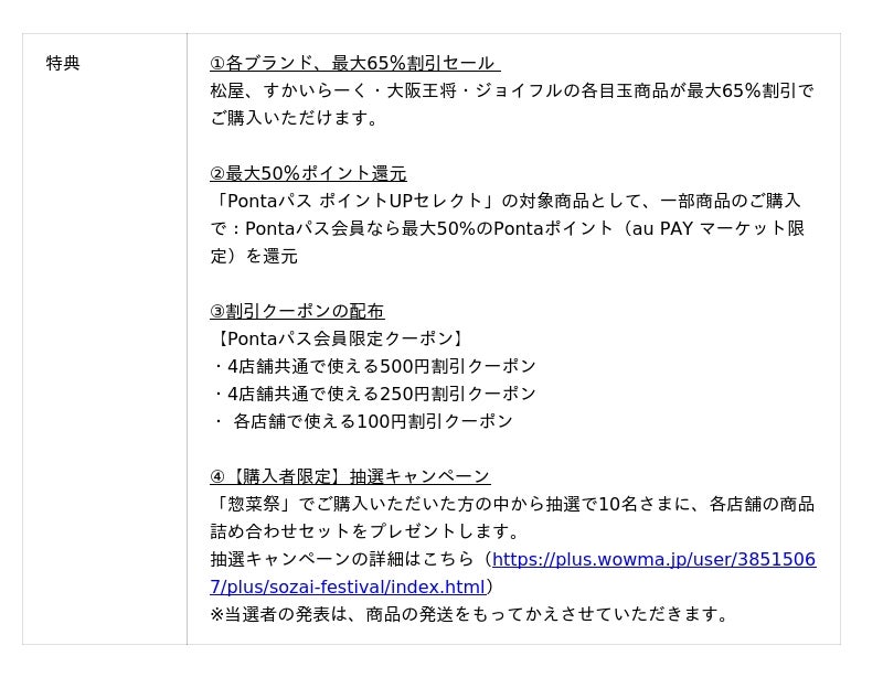 「惣菜祭」は、2025年8月にネット通販初の取り組みとしてご好評いただいた「松屋フーズ」と「すかいらーくグループ」とのコラボレーションに加えて、新たに「大阪王将公式通販」と「ジョイフルオンラインショップ au PAY マーケット店」が参加し、グルメ業界で人気の4大チェーンがコラボレーションしたおトクな7日間となります。