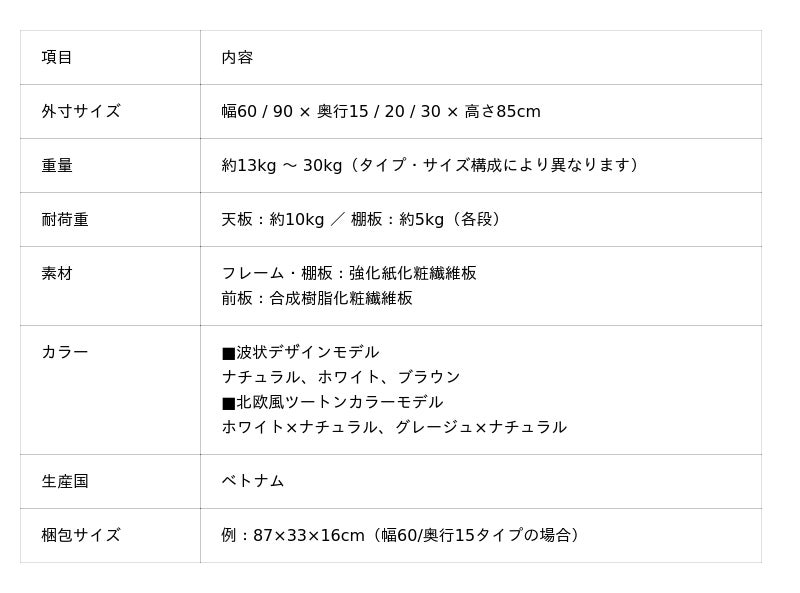 奥行: 15cm、20cm、30cm の3種類が展開されており、広さに合わせたスリムな設置が可能です。