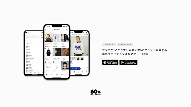 SNSフォロワー総40万超。10万点以上の『日本未上陸』商品が並ぶ越境ECサイト「60%」(シックスティーパーセント)はZ世代ユーザーを中心に日本および世界50カ国以上のユーザーからの購入をいただいております。100,000点以上の商品ラインアップを誇り、全ての出店ブランドと直接契約をしている事で、海外商品の購入に抵抗感を感じるお客様の悩みを解決しております。また、おすすめ情報サービス「mybest」にて、2023年通販アプリで堂々の第5位を獲得しております。(出典元: