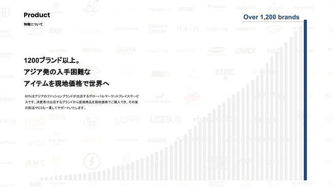 日本国内最大級を誇るアジアブランドの出店数韓国を筆頭にインドネシア、香港などから述べ1200ブランド以上の入店数を誇るオンラインストアとして事業を展開しております。日本国内では最大級のアジアブランドの出店数となっており、入手困難なアジアで人気なアパレルブランドを現地価格で簡単に購入ができる事で注目を集めております。