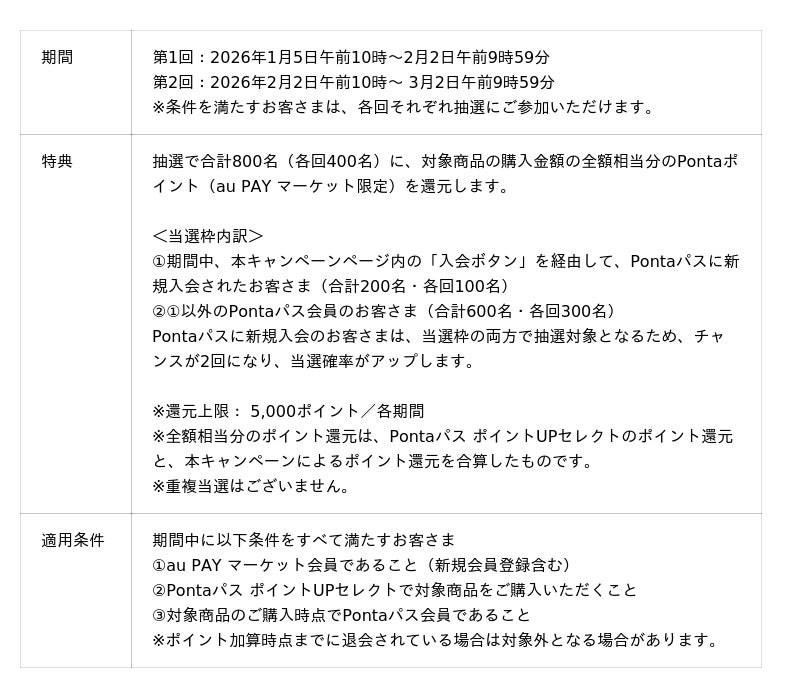 本キャンペーンは、期間中に「Pontaパス ポイントUPセレクト」の対象商品をご購入いただくと、抽選で合計800名さまに購入金額の最大全額相当分(上限5,000ポイント)をPontaポイント(au PAY マーケット限定)として還元します。最大全額相当分の還元は、対象商品が最大50%還元となる「Pontaパス ポイントUPセレクト」とあわせての還元となり、抽選は期間中に全2回ご参加いただけます。