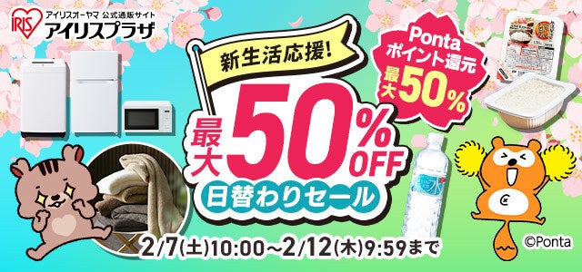 さらに、「アイリスプラザ」「シュクレイ」のおトクな特典として、「アイリスプラザ」では新生活で活躍する家電・寝具や日用品、お肉やスイーツなどが最大50%割引でご購入いただけるほか、「シュクレイ」ではバレンタインデー直前の特別企画で、ザ・メープルマニアやバターバトラーなどの人気商品が最大30%ポイント還元となり、おトクにお買い物をお楽しみいただけます。