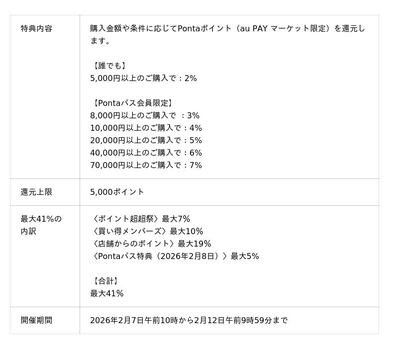 ポイント超超祭の特典として、購入金額に応じて最大7%のPontaポイント(au PAY マーケット限定)を還元し、店舗からの特典や買い得メンバーズの特典をあわせると最大36%還元となります。また、Pontaパス会員なら2026年2月8日は、対象商品のご購入で最大41%のポイント還元となります。
