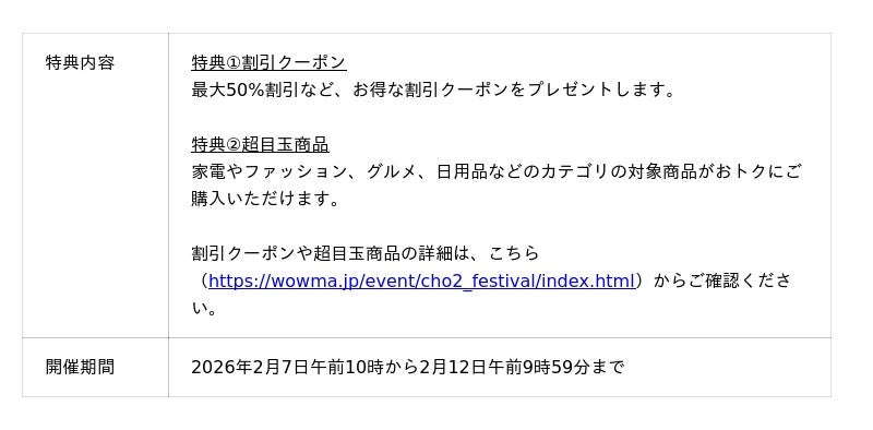 ■ポイント超超祭の特典(https://wowma.jp/event/cho2_festival/index.html)