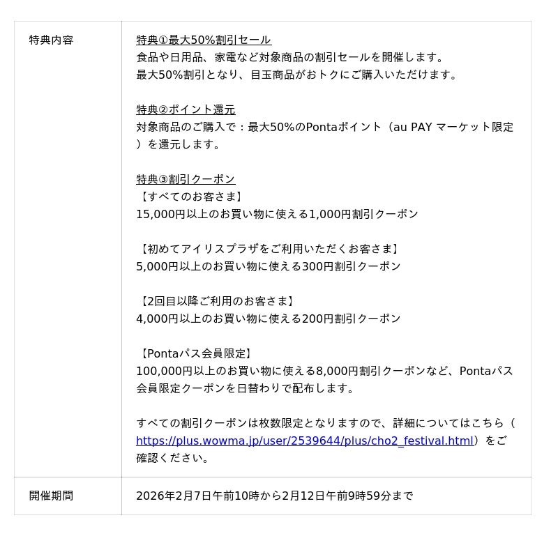 1.アイリスプラザ(https://plus.wowma.jp/user/2539644/plus/cho2_festival.html)