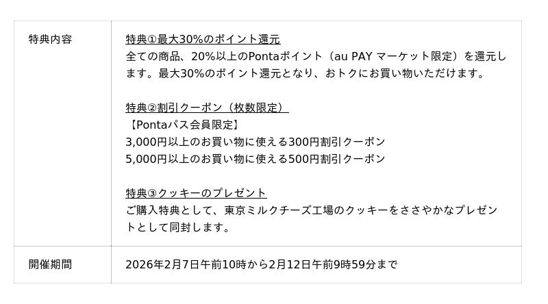 auコマース&ライフは、2026年2月7日から2月12日までの期間、総合ショッピングサイト「au PAY マーケット」で「ポイント超超祭」を開催します。あわせて、暮らしを支える「アイリスプラザ」と、人気スイーツブランドを展開する「シュクレイ」のおトクな特典を提供します。