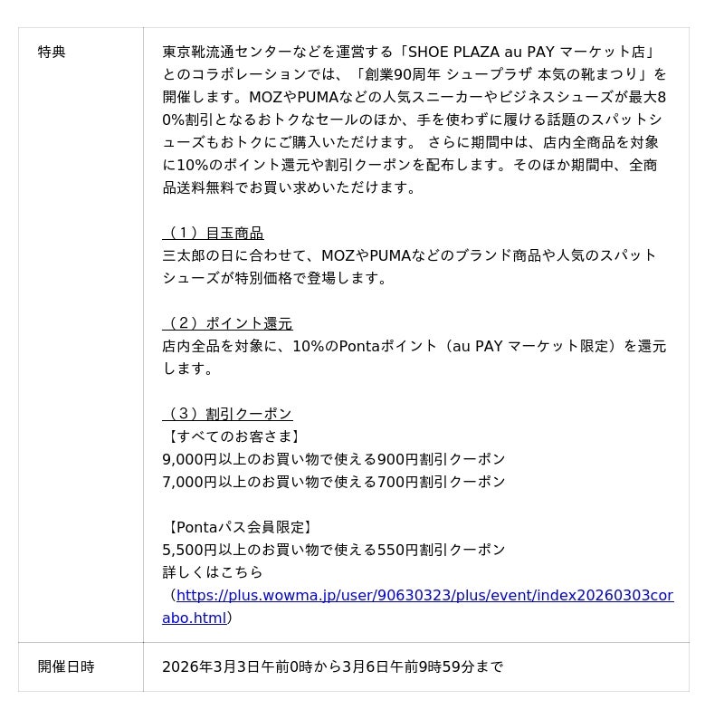 ■店舗コラボレーションセールについて(1)SHOE PLAZA au PAY マーケット店(https://plus.wowma.jp/user/90630323/plus/event/index20260303corabo.html)