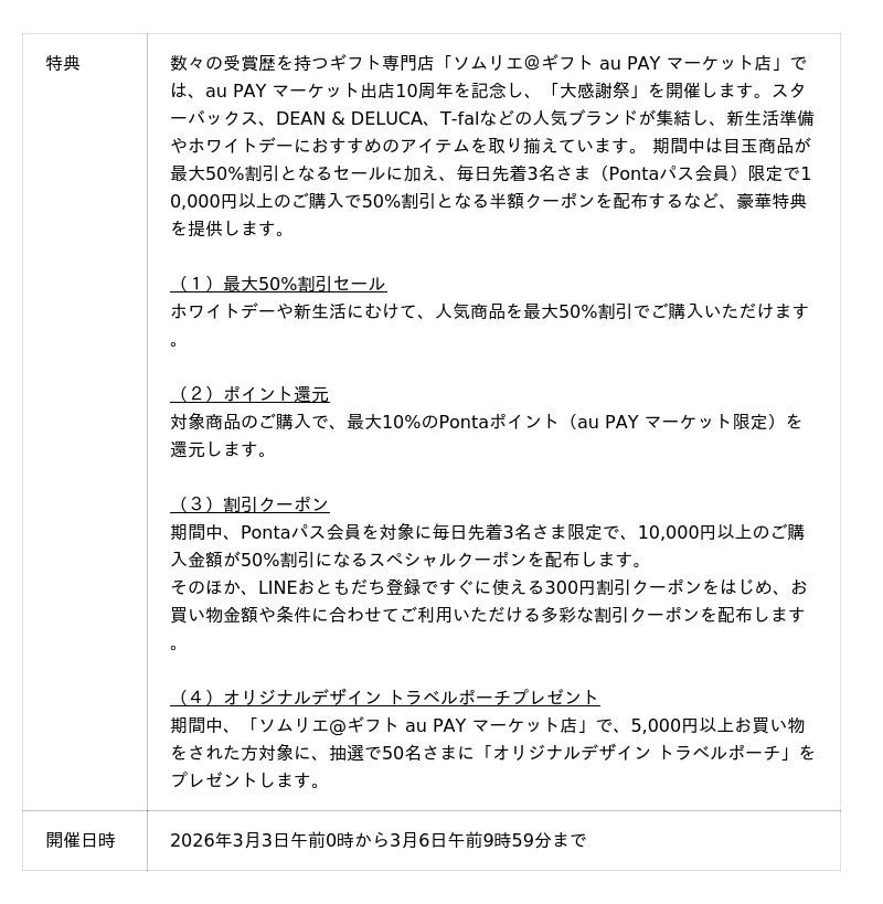春の新生活に向けて、靴専門店「SHOE PLAZA au PAY マーケット店」では、MOZやPUMAなどのブランド商品や人気のスパットシューズなど、通学・通勤や春のお出かけに最適な商品が最大80%割引でご購入いただけます。また、ギフト専門店「ソムリエ@ギフト au PAY マーケット店」では、出店10周年の感謝を込めた大感謝祭として、新生活やホワイトデー商品が最大50%割引で購入できる割引セールや毎日先着でPontaパス会員限定の半額クーポン配布を行います。