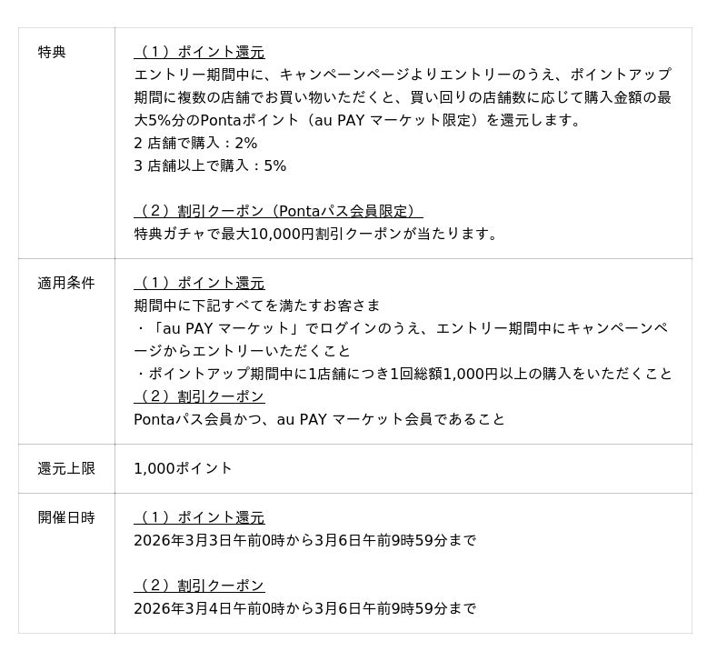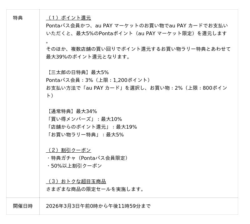 auコマース&ライフは、総合ショッピングサイト「au PAY マーケット」において、2026年3月3日から3月6日までの期間、三太郎の日およびお買い物ラリーを開催します。