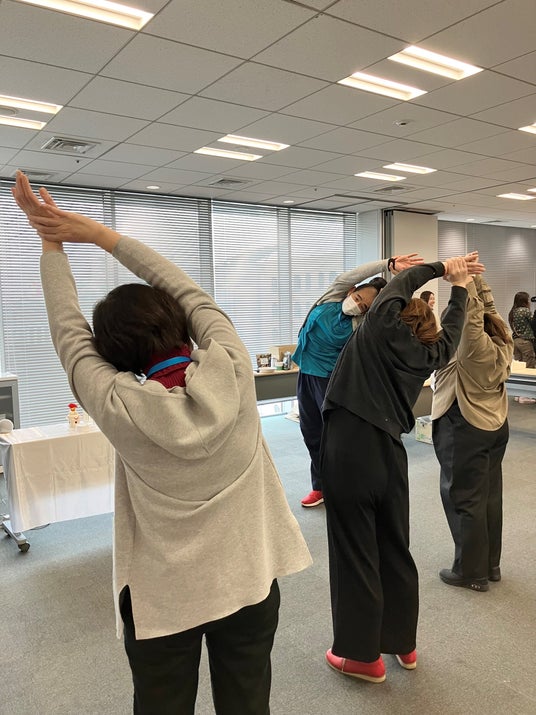 【スタートワークストレッチ】休暇中の胃腸疲れをとり、リフレッシュして業務スタート!当社には社員がウェルエイジングを体現するため、カラダの健康面をサポートするヘルスキーパー(企業内理療士)がいます。当社ヘルスキーパーに、長期休暇あけに最適な、胃腸疲れを軽減する、簡単ストレッチをレクチャーしてもらい、心身ともにリフレッシュして業務を開始しました。