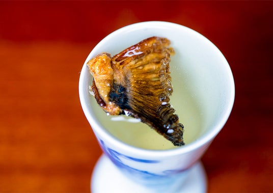 5.香り高いひれ酒 軽く炙った焼きひれに80℃の熱燗を注ぐだけ。香ばしい香りが夫婦の夜を包みます。