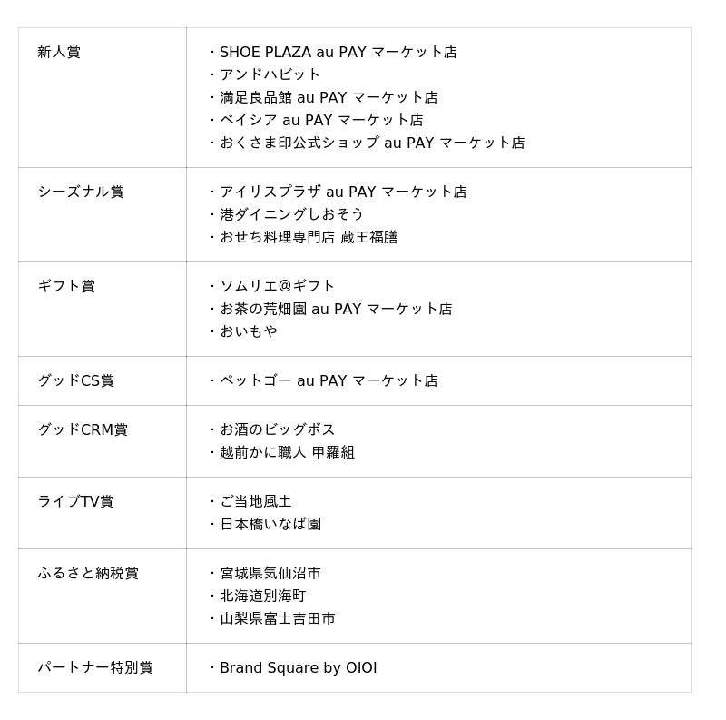 そのほか、2025年に新たにau PAY マーケットへ出店し躍進した店舗に贈られる「新人賞」をはじめ、本年度より新設された「グッドCRM賞」、お客さまへの優れた応対を評価する「グッドCS賞」、さらには「au PAY ふるさと納税」を通じて地域活性に貢献した自治体への「ふるさと納税賞」など、計145店舗(自治体含む)が受賞しました。