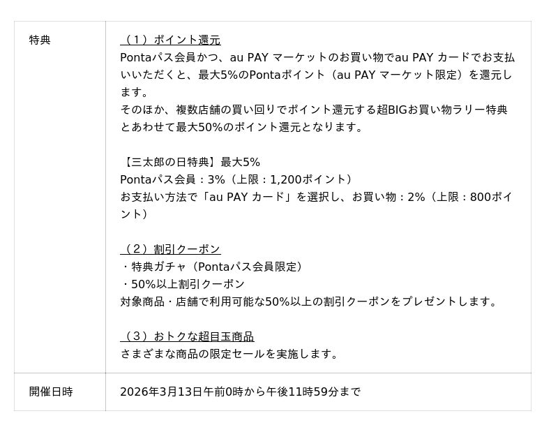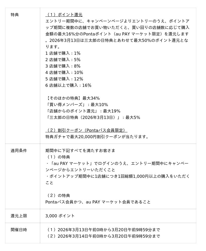 本キャンペーンでは、買い回りの店舗数に応じてPontaポイント(au PAY マーケット限定)を還元し、2店舗での購入で購入金額の5%、6店舗以上の購入では最大16%の還元となります。2026年3月13日は三太郎の日特典とあわせて最大50%のポイント還元となります。そのほか、ハズレなしの特典ガチャ、50%以上割引クーポンの配布、超目玉商品セールを実施し、おトクにお買い物をお楽しみいただけます。