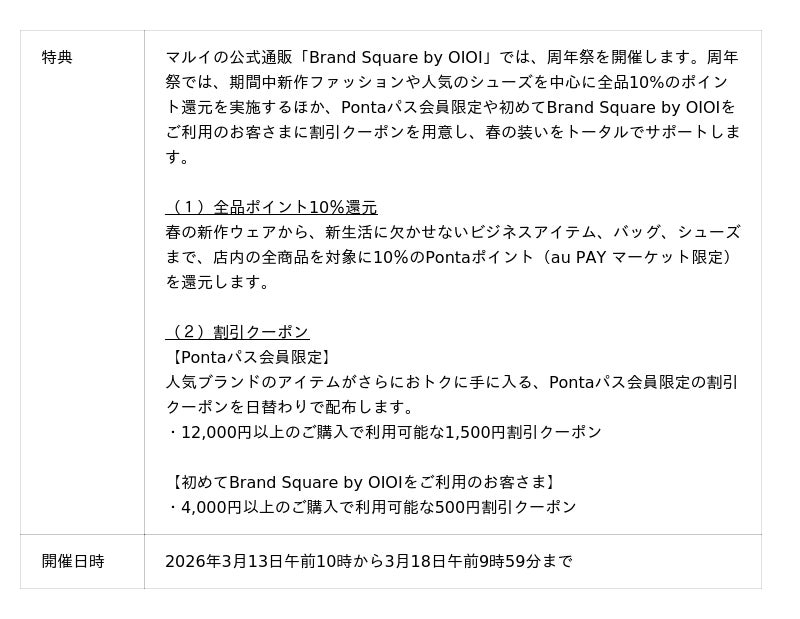 さらに今回は、新生活を「心地よく、おいしく、美しく」スタートさせるための準備をサポートする4大ブランドが集結し、春の装いを刷新する「Brand Square by OIOI」や、自分を労る「Yunth」、住まいを整える「レック」、そして仙台の牛タンで門出を祝う「mog-mog」など、暮らしの質をワンランク引き上げる厳選アイテムを多数ラインナップしたコラボレーションセールも同時開催します。