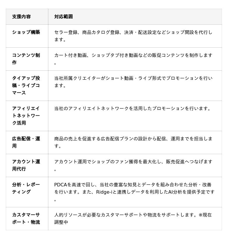 当社のが提供するTikTok Shop導入・運用支援サービスでは、以下の内容を一気通貫で対応します。