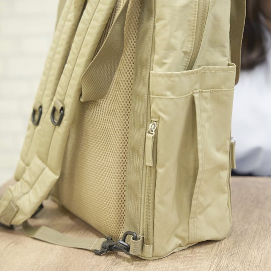 反対側のサイドポケットはウェットティッシュを入れて使用できる仕様に。ワンアクションでウェットティッシュを取り出すことができるので、外出先でのお食事シーンなどで大活躍です。横のファスナーポケットはスマートフォンやパスケースを入れるのにぴったりです。