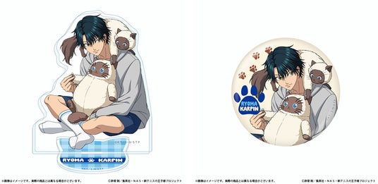 ▲「カルピンとおうち時間」シリーズ商品 「アクリルスタンド 越前リョーマ&カルピン」(左)、「75mm缶バッジ 越前リョーマ&カルピン」(右)