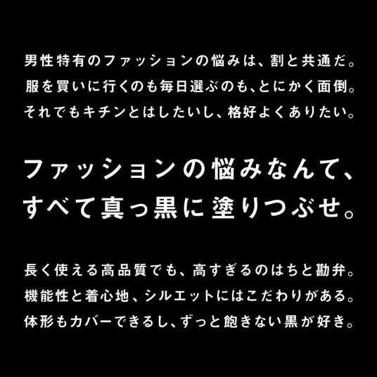 男性の私服選びの悩みを解消するために誕生しました。『ファッションの悩みなんて、すべて真っ黒に塗りつぶせ。』をコンセプトに、“