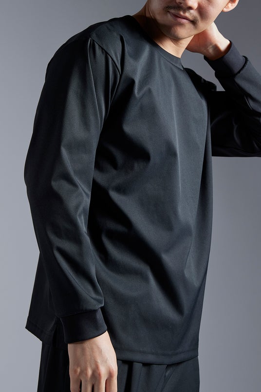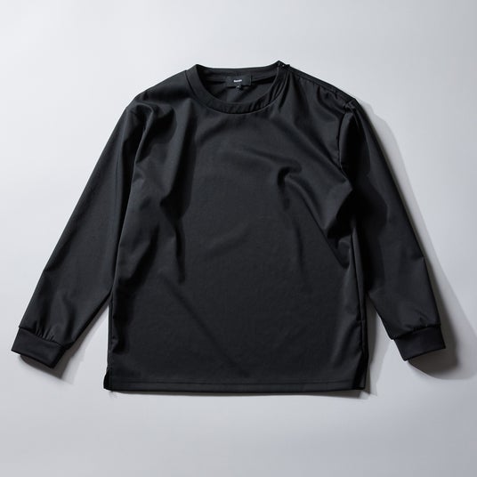 特徴:体のラインを拾わないボックス型シルエットの長袖Tシャツ。左肩には着脱しやすいコンシールファスナー付き。撥水・速乾。