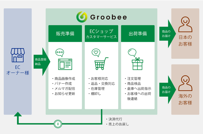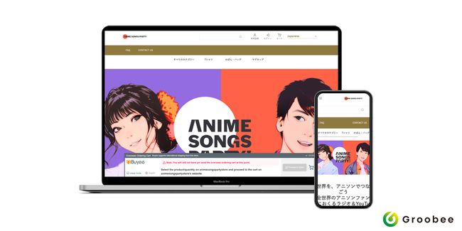 https://groobee.com )」ではサイト構築から運営まで一気通貫でサポート、アーティスト・アニメやキャラクター等のコンテンツに特化しており、単独型からモール型でのECサイト展開まで対応が可能です。また、海外向け購入サポートサービス「Buyee」との連携もできるため、世界118の国・地域のファンから商品の購入が可能になるなどエンターテインメントに最適な機能が詰まっています。
