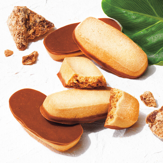 郷土菓子「ちんすこう」に黒糖チョコレートをコーティング沖縄の郷土菓子をロイズのレシピでアレンジし、ザクザクとした食感が魅力のちんすこうに仕上げました。沖縄県産さとうきびのきび糖を使用したちんすこうの片面に、沖縄県産の黒糖を使ったチョコレートをコーティング。生地に効かせた塩味が味わいのアクセント。コクのあるきび糖と塩味、黒糖チョコレートの素朴でまろやかな味わいがとけ合います。