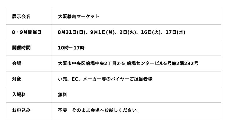 株式会社オークファン株式会社オークファン(本社:東京都品川区、代表取締役:武永修一)が運営する『大阪義烏マーケット』が、今月は19日(火)、20日(水)、31日(日)に開催予定です。大阪義烏マーケットでは、中国にある世界最大級の卸市場である義烏マーケットから選び抜かれた商品を、日本で実際に見て、触れて仕入れができます。中国商品の輸入を検討中のバイヤーの皆さまは、ぜひ本展示会へお越しください。