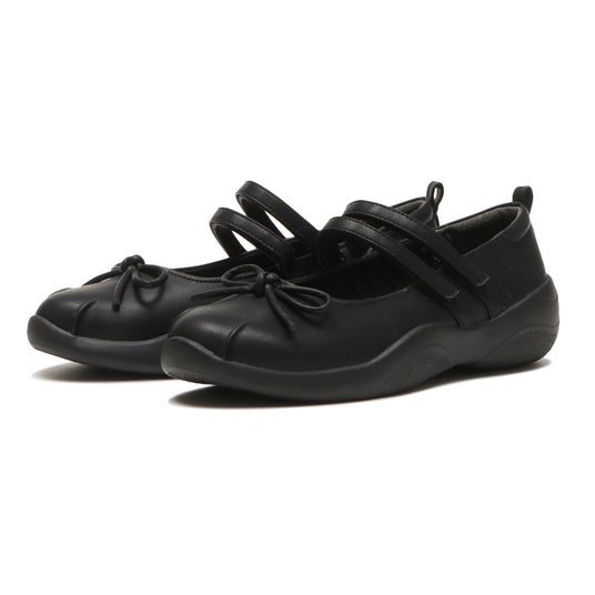 シンプルなアッパーデザインに二本のベルトが目を惹くメリージェーン。つま先部分の折り込みがアクセントとなり、ベルトはベルクロ仕様で着脱も容易に。リボンでかわいさをアップしつつ、シンプルなデザインでスタイル問わず大活躍してくれる一足です。