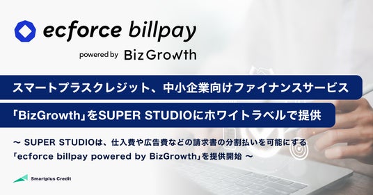 次世代金融インフラの提供を通して組込型金融を実現するFinatextグループの株式会社スマートプラスクレジット(本社:東京都千代田区、代表取締役:大澤 和明、以下「スマートプラスクレジット」)は、中小企業向けファイナンスサービス「BizGrowth(ビズグロース)」を株式会社SUPER STUDIO(本社:東京都目黒区、代表取締役社長 CEO:林 紘祐、以下「SUPER STUDIO」)にホワイトラベルで提供します。これを受けてSUPER STUDIOは、請求書支払いをより柔軟にする新サービス「ecforce billpay」のラインアップの1つとして、「ecforce billpay powered by BizGrowth」の提供を開始します。