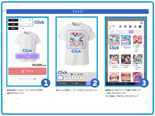 株式会社バンダイナムコフィルムワークス[代表取締役社長:浅沼 誠、住所:東京都杉並区]は、『ラブライブ!サンシャイン!!』に登場するスクールアイドルグループ「Aqours」のCDジャケットイラストを自由に組み合わせてオリジナルTシャツ・トートバッグを作成する商品「ラブライブ!サンシャイン!! カスタマイズグッズ」を発売します。