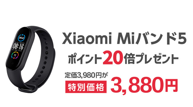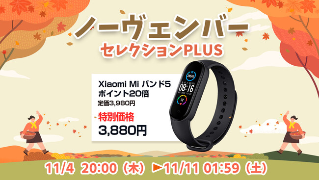 楽天市場「Show !t」は11月4日(土)20時から、ポイント20倍プレゼント!シャオミのMiバンド5を通常価格3,980円(税込)のところ3,880円(税込)の特別価格で販売します。また、11月4日(土)20:00~11月11日(土)01:59まで開催される、楽天お買い物マラソンに参加し、全商品ポイント10倍プレゼント(一部商品を除く)を実施します。この機会にシャオミのスマートバンドMiバンド5でポイントをザクザク貯めましょう。