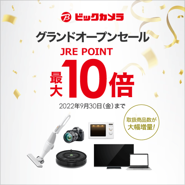 期間中に「ビックカメラ JRE MALL店」でお買い物いただくと、通常100円1ポイントのところ最大10ポイント貯まります。