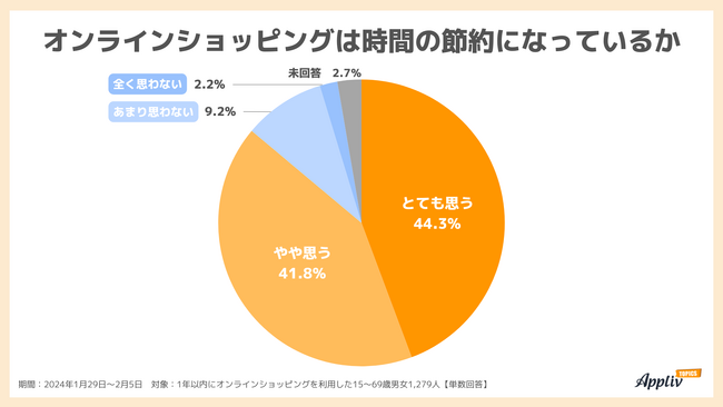 ■9割近くの人が、オンラインショッピングで時間の無駄を省けると回答オンラインショッピングが時間の節約になっていると思うかを聞いてみると、「とても思う(44.3%)」、「やや思う(41.8%)」となっており、86.1%が時間の無駄を省けていると実感していることが分かりました。