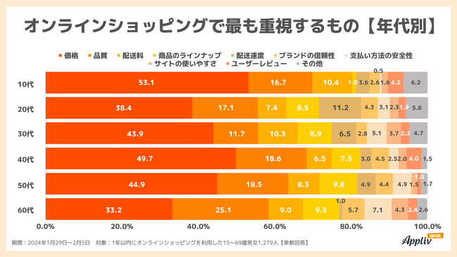 年代別で見てみると、「価格」を重視している割合は10代が最も高く53.1%、60代が最も低く33.2%となっています。