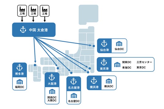 複数のサプライヤーから出荷される商品を集約し、物流センター別に仕立てたコンテナで日本向けに出荷
