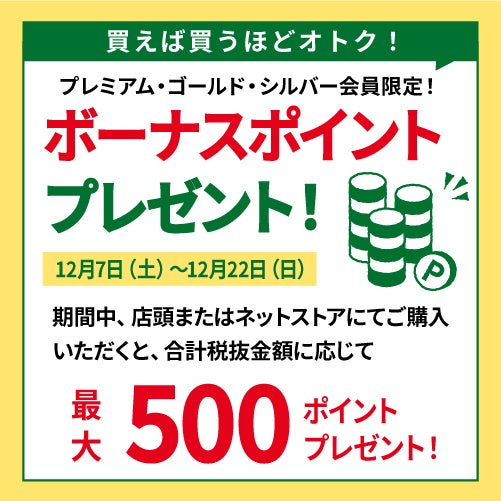 ■ プレミアム・ゴールド・シルバー会員限定ボーナスポイントプレゼントプレミアム・ゴールド・シルバー会員のみなさまには、期間中の合計購入金額に応じて、